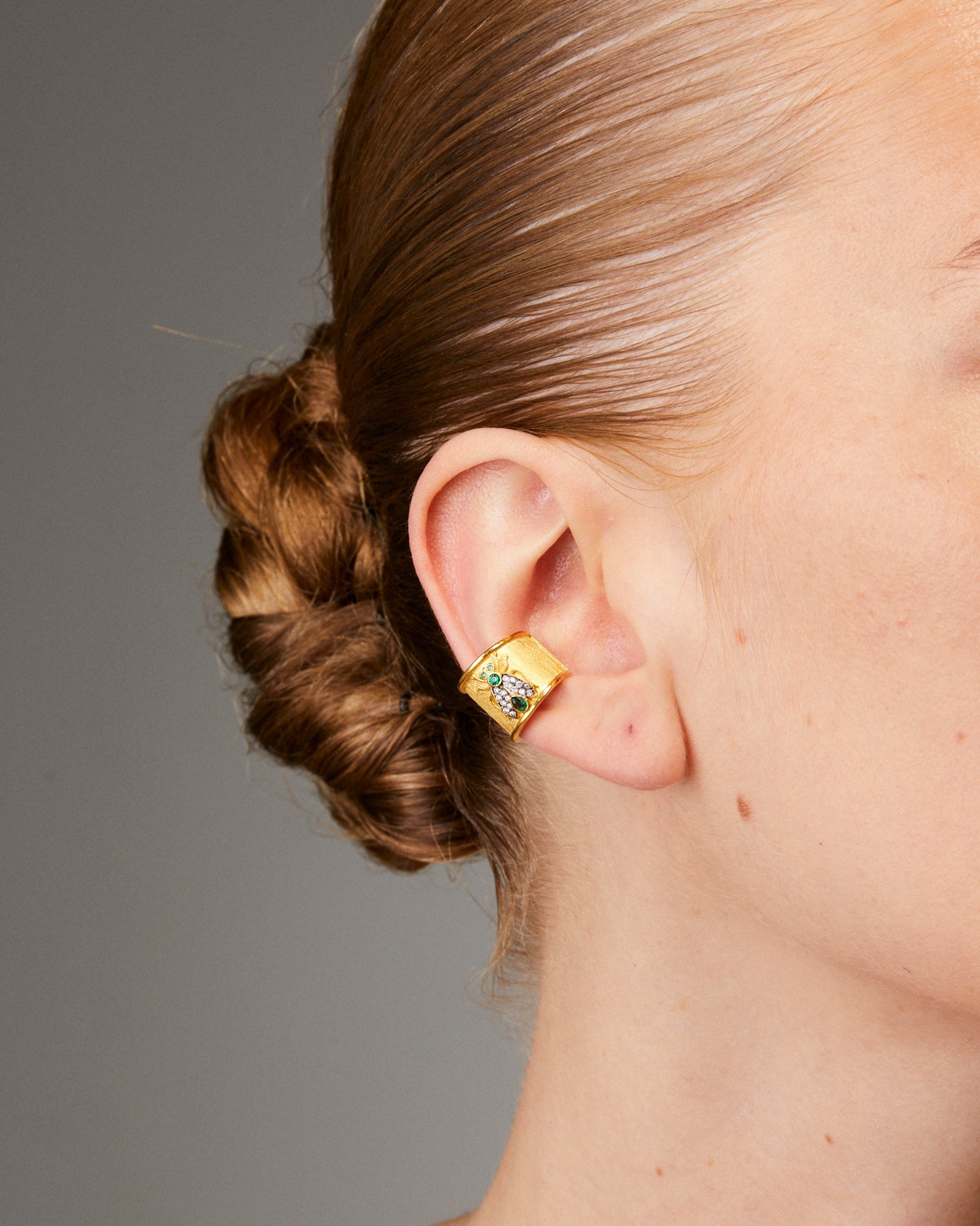 The Mosquito Earcuff by Begüm Khan is a stunning and edgy accessory that adds boldness and glamour to your look. With its intricate design and luxurious green crystal and gold plating, this earcuff is the perfect statement piece for those who love to stand out and make a statement.