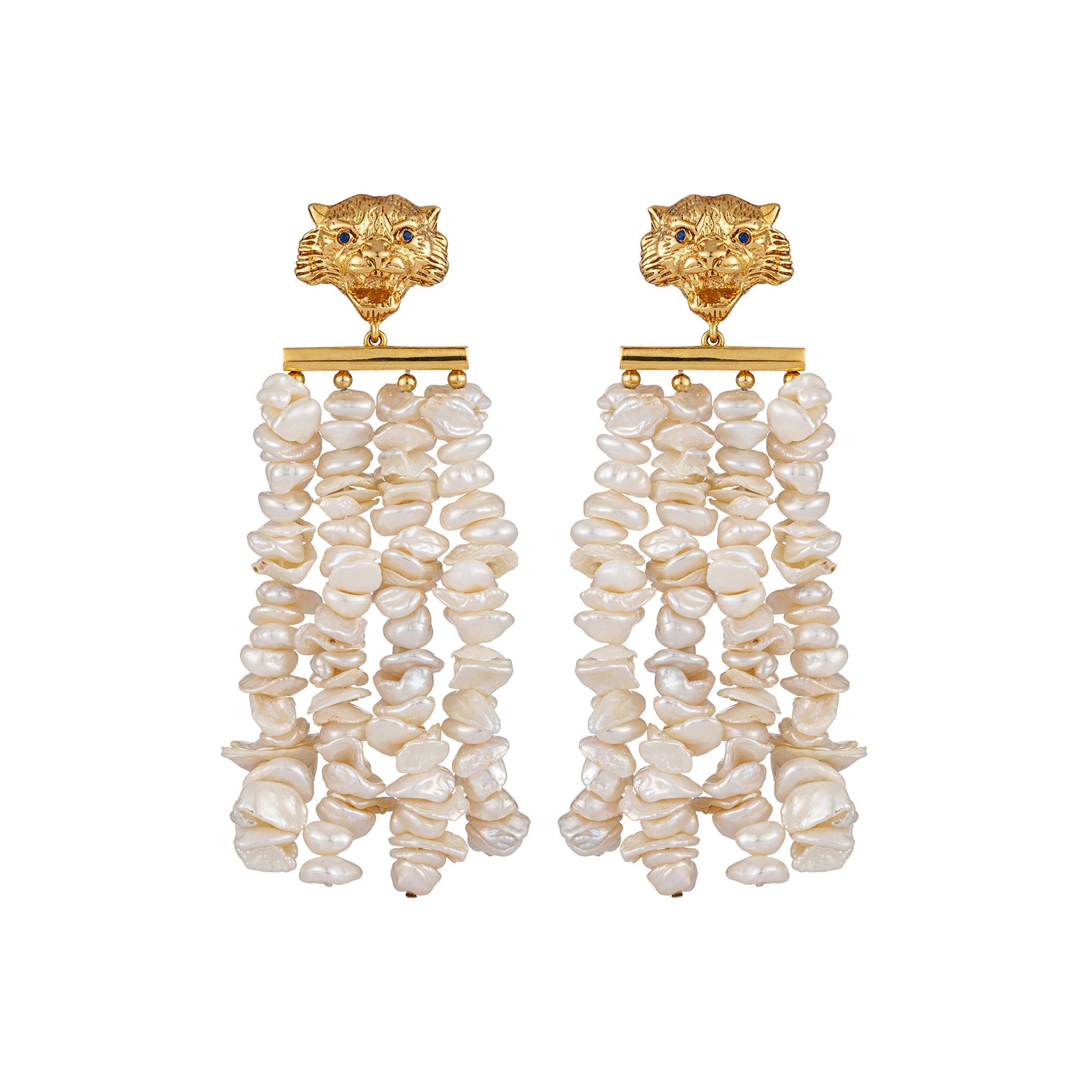 Perfect for independent women with purpose and passion, our Tiger Florence Earrings pay tribute to the king of the jungle cats. Like all Begum Khan’s pieces, they are handmade by local artisans in Istanbul. Intricately engraved in gold-plated bronze, the tiger’s head motif appears above four strands of lustrous organic-shaped pearls, suspended from a gold bar. Wear with a high ponytail or a low bun for a fiercely beautiful look.