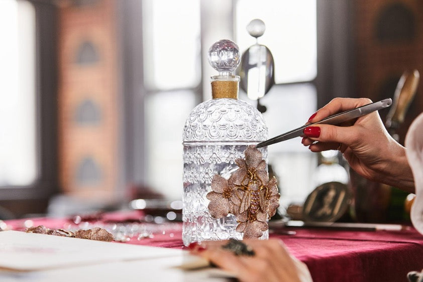 Like a unique work of art, the Bee Bottle, dressed in a finery of gold-plated bronze adorned with precious stones, as dreamt up by Begüm Kıroğlu. In her magical design, an imperial bee, the Guerlain symbol, escapes from its dreamlike universe for a fleeting moment to land on the bottle, encircled by four majestic flowers. Limited edition bottles which are handmade by Turkish craftsmen in a historic workshop in the old part of Istanbul, through a labour of love that imbues every bottle with its own personality and soul. The final touch was the Dames de Table of the Guerlain Ateliers adorn the bottle with this precious embellishment, crowning the piece with a fine gold thread around the neck of the bottle.